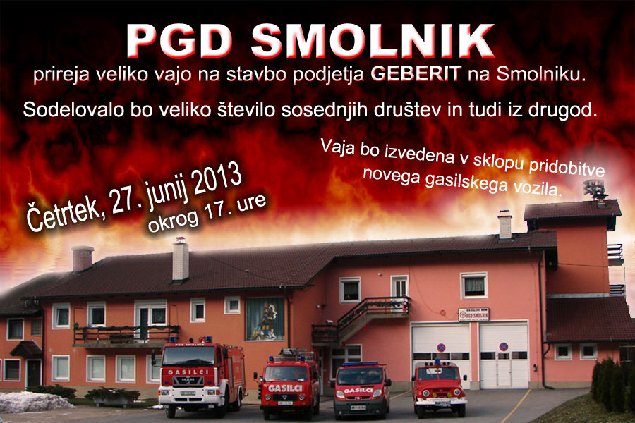 V četrtek, dne 27. 6. 2013, PGD Smolnik prireja veliko vajo na stavbo podjetja Geberit na Smolniku. Sodelovalo bo veliko število sosednjih društev!